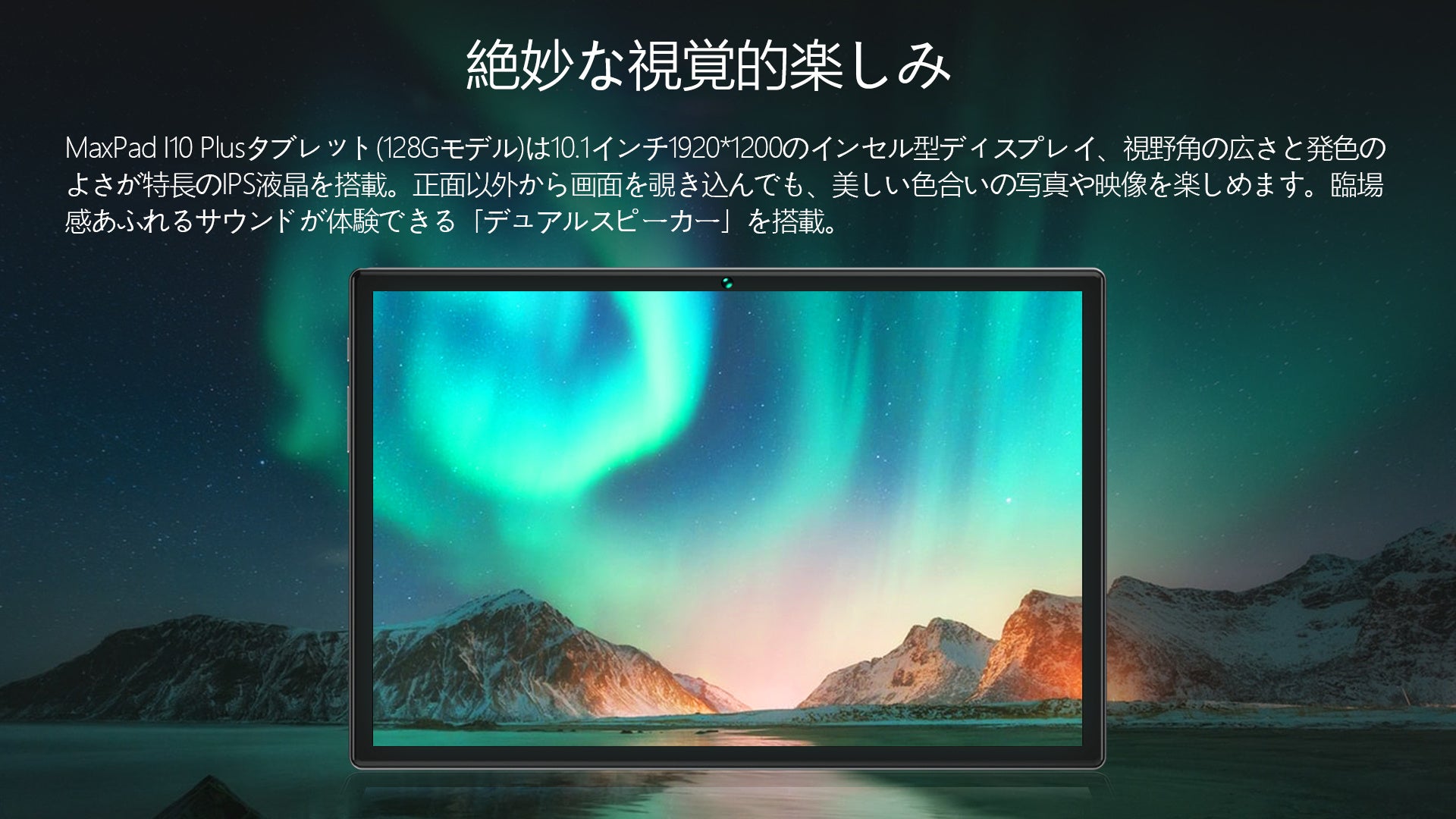 MaxPad I10 Plusタブレット(128Gモデル)は10.1インチ1920*1200のインセル型ディスプレイ、視野角の広さと発色のよさが特長のIPS液晶を搭載。正面以外から画面を覗き込んでも、美しい色合いの写真や映像を楽しめます。臨場感あふれるサウンドが体験できる「デュアルスピーカー」を搭載。