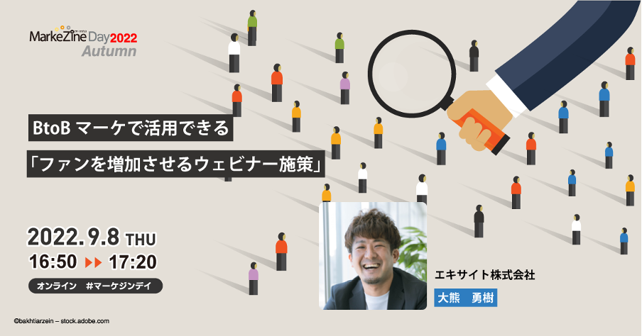 「BtoBマーケで活用できるファンを増加させるウェビナー施策」をテーマに、BtoBマーケティングにおける顧客獲得に役立つ、ウェビナー施策の設計方法や成功事例をお伝えします。