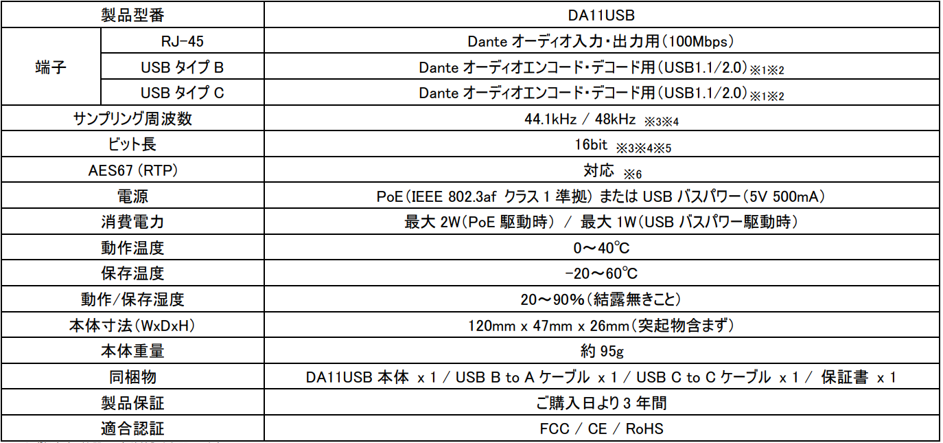 ※4 Dante Controllerおいて入力2ch/出力2chとして認識されます。また16/24/32ビット、44.1/48/88.1/96kHzの設定が選択可能です。
