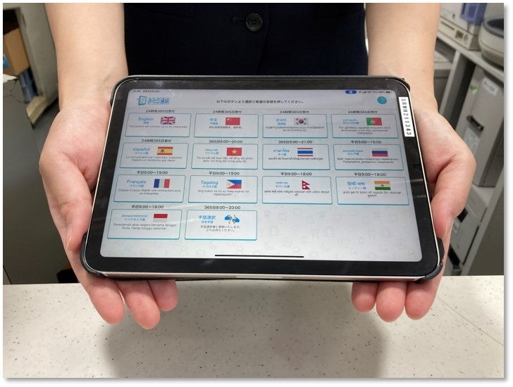 「みえる通訳」は、タブレット端末やスマートフォンの画面上に、テレビ電話形式で通訳者を呼び出し、対面でのコミュニケーションをサポートする通訳サービスです。在住外国人の約96%をカバーする13言語を提供しており、ベトナム語やネパール語など東南アジアの言語にも対応しています。また、手話通訳(日本手話)が標準提供されているのも特徴の一つです。