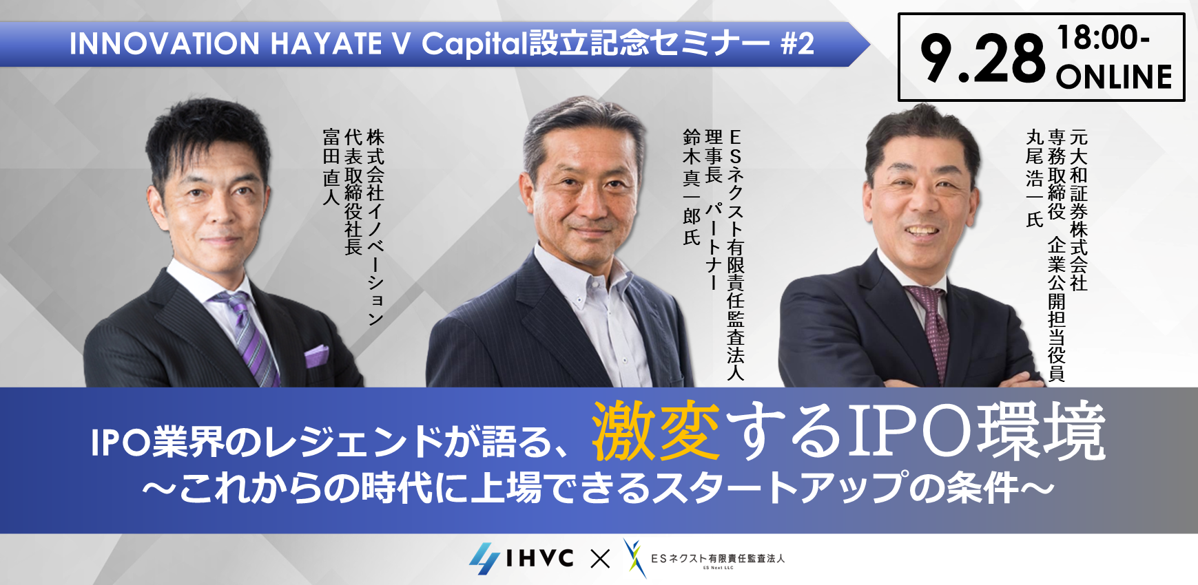 本セミナーではINNOVATION HAYATE V Capitalの設立を記念して、ハンズオンパートナーであるESネクスト有限責任監査法人の鈴木氏と500社を超える企業のIPOに関わってきた、元大和証券IPO担当役員丸尾氏をお招きし数多くのスタートアップの上場を支援し、見届けてきたからこそ語れる、“激変するIPO環境~これからの時代に上場できるスタートアップの条件~”についてお話しいただきます。