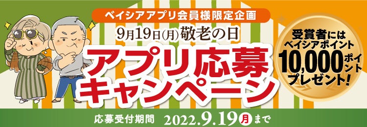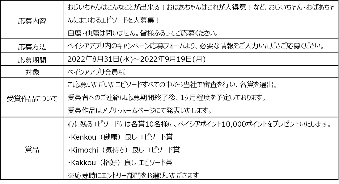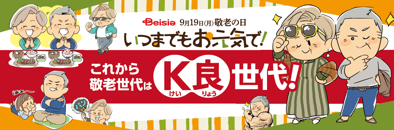 株式会社ベイシア(本社:群馬県前橋市、代表取締役社長:相木孝仁)は、8月31日(水)~9月19日(月)の期間で、「おじいちゃん・おばあちゃんのここがすごい!」と題して、皆様からのエピソードをベイシアアプリ内で募集いたします。ご応募いただいたエピソードの中から心に残る各賞を選出し、賞品としてベイシアポイントをプレゼントいたします。また店内各所では「これから敬老世代は『K良世代』」として、健康(Kenkou)など「K」から始まるテーマで現代の活き活きとした敬老世代をイラストでご紹介いたします。ぜひ店頭にてご覧ください。