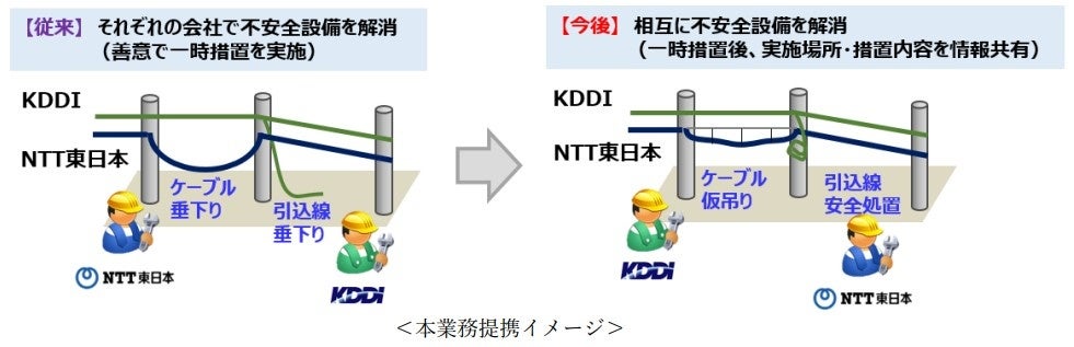NTT 東日本と KDDI は、これまでも両社が各々に管理する通信設備について、不安全な状態を発見した際には、相互における業務連携などの明確な取り決めがない中でも、互いに連絡を取り合い、安全性の維持・早期確保に努めてきました。その中で、2019 年に千葉県地域を中心とした台風災害による不安全状態の多発が契機となり、2020 年より展開が進められた「NTT 東日本と千葉県内において事業を営む複数のケーブルテレビ事業者との業務提携」(注)において、一定の効果があったことから、同様のメリットが見込まれると考え、本業務提携に至りました。