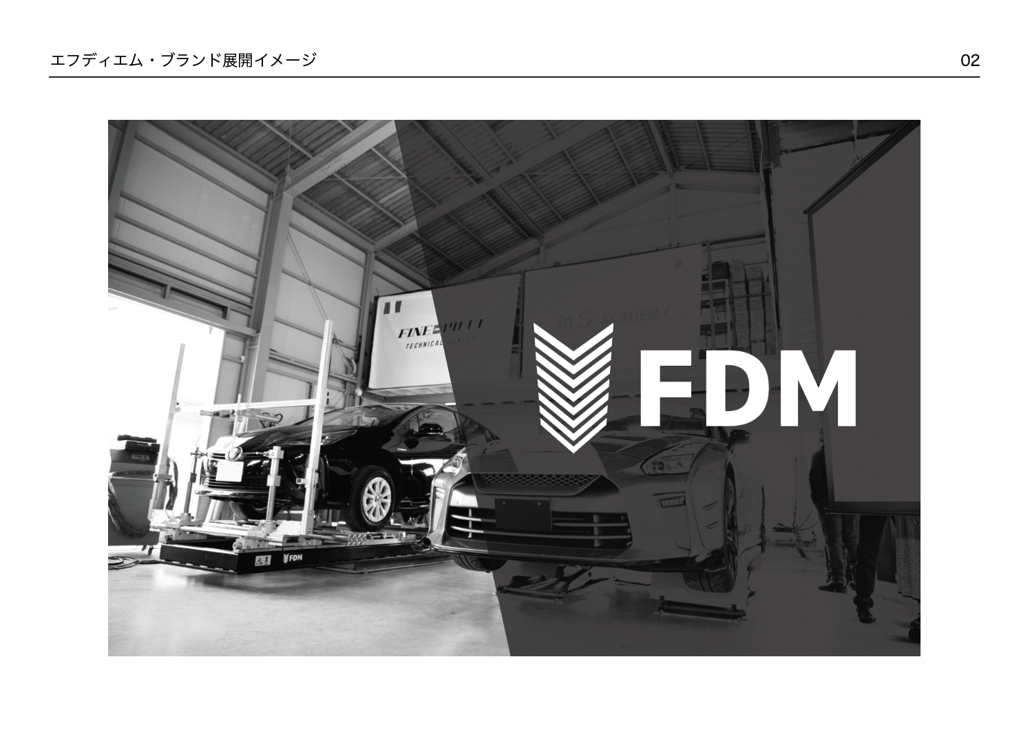 溶接機やフレーム修正機など、板金塗装に特化したプロフェッショナル向け整備機器メーカー「エフディエム(FDM)」のCI(コーポレート・アイデンティティ)構築を担当した。