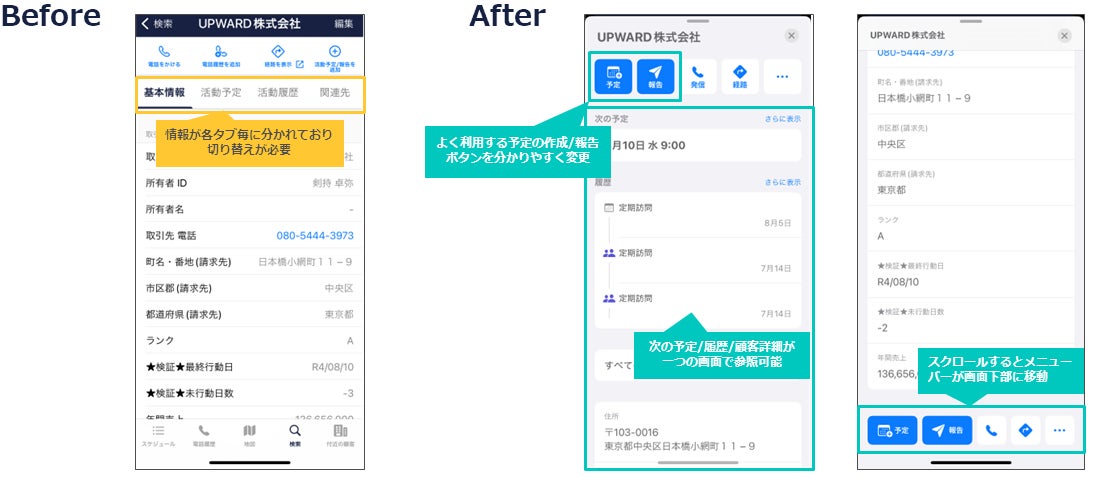 改善前の画面では「顧客の基本情報」「活動予定」「これまでの活動履歴」などの情報がタブで分かれており、切り替えが必要でした。このたびの改善により、よく利用される「予定作成」「活動報告」ボタンを操作しやすい位置に設置。次の活動予定や履歴、顧客情報の詳細が一つの画面で参照可能になり、見やすさ・使いやすさが向上しました。