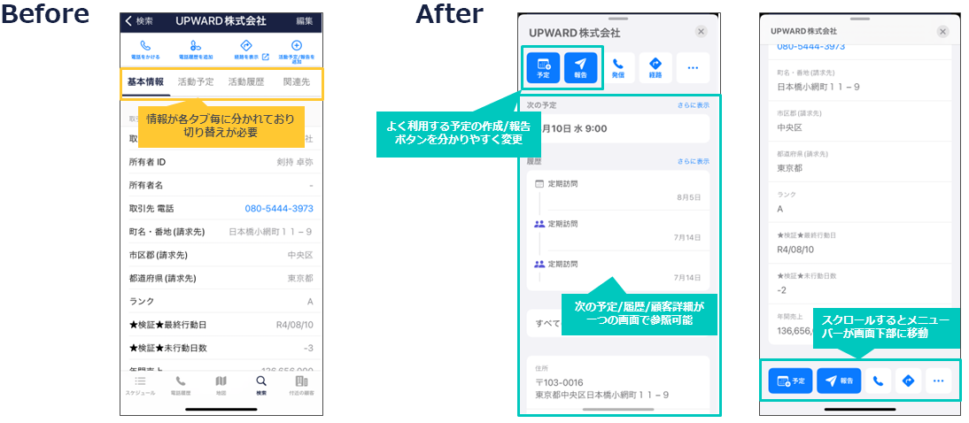 改善前の画面では「顧客の基本情報」「活動予定」「これまでの活動履歴」などの情報がタブで分かれており、切り替えが必要でした。このたびの改善により、よく利用される「予定作成」「活動報告」ボタンを操作しやすい位置に設置。次の活動予定や履歴、顧客情報の詳細が一つの画面で参照可能になり、見やすさ・使いやすさが向上しました。