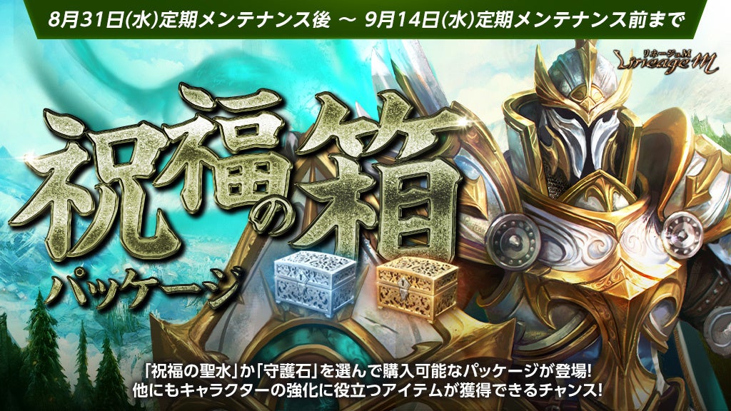 紋様の強化に有効な「紋様初期化の巻物(イベント)」、「祝福の聖水(大)箱(1~5個)」、「コイン選択箱」がセットになった「祝福の箱パッケージ(祝福の聖水)」と、スキルツリーの守護星の活性化に必要な「守護石」、武具へ祝福付与を行える「祝福付与の巻物箱(1~20枚)」、爵位システムの昇級試に使用する「上級祝福の粉箱」がセットになった「祝福の箱パッケージ(守護石)」の、2種類のパッケージが登場しました。