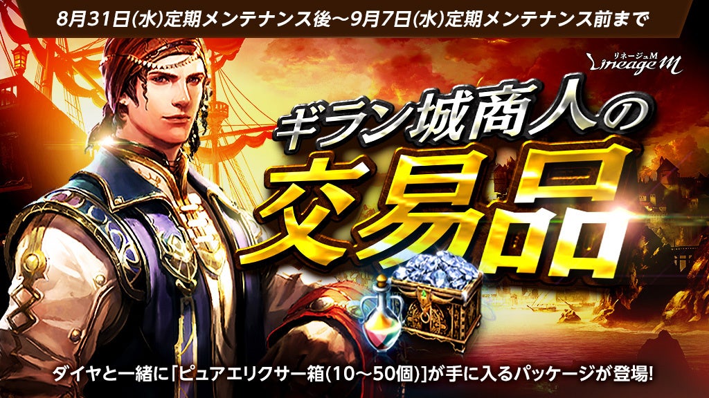 ダイヤと、「ピュアエリクサー箱(10~50個)」2個がセットになった「ギラン城商人の交易品」が登場しました。