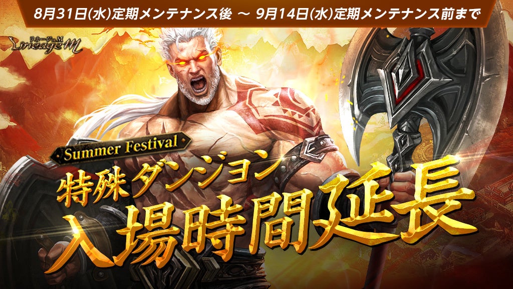 PCオンラインRPG「リネージュ」のモバイル版タイトル『Lineage M(以下、リネージュM)』のサービス、運営をしているエヌ・シー・ジャパン株式会社(東京都港区、代表取締役:金 澤憲(キム テクホン) 以下、エヌシージャパン)は、2022年8月31日(水)に、「Summer Festival in ADEN」第七弾として、「TJのクーポン」第二弾の登場、イベント「特殊ダンジョン時間増加イベント」、3週連続クラスチェンジ2週目の開催、新アイテム「希望のロウソク(能力値)」の登場、及び新たなパッケージの登場をお知らせします。