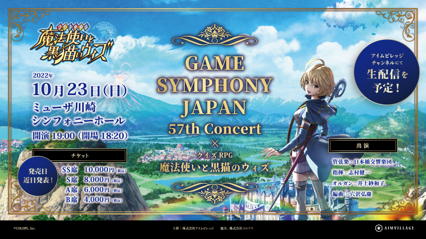 世界屈指の音響を誇るミューザ川崎シンフォニーホールにて、株式会社アイムビレッジが主催を務める「GAME SYMPHONY JAPAN 57th Concert ✕ クイズRPG 魔法使いと黒猫のウィズ」が開催決定!「アイムビレッジチャンネル」にて、アーカイブ付き生配信も予定されています。