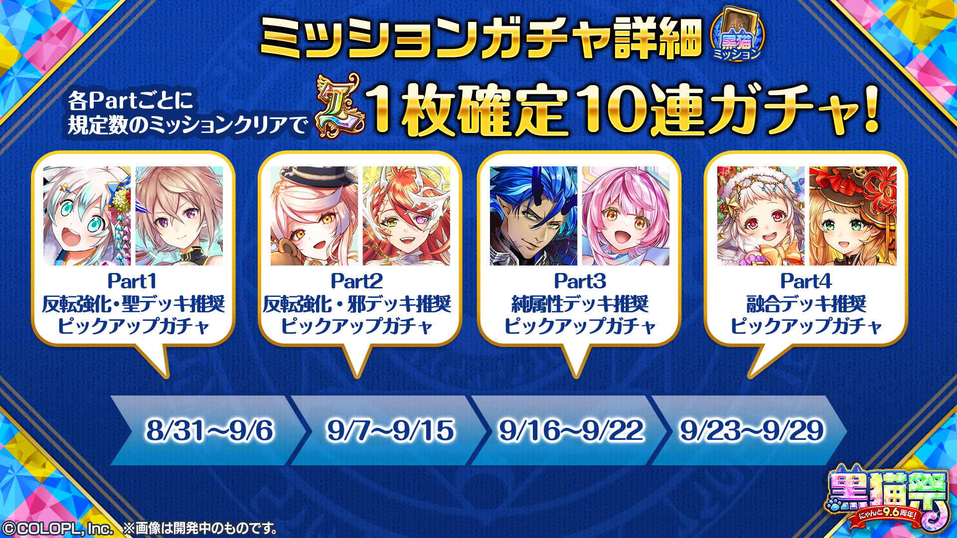 「黒猫祭デイリーミッションガチャ」は4つの期間に分かれており、期間ごとに一定数のミッション達成で1枚L確定の10連ガチャを回すことができる最大70連のミッションガチャを開催いたします。