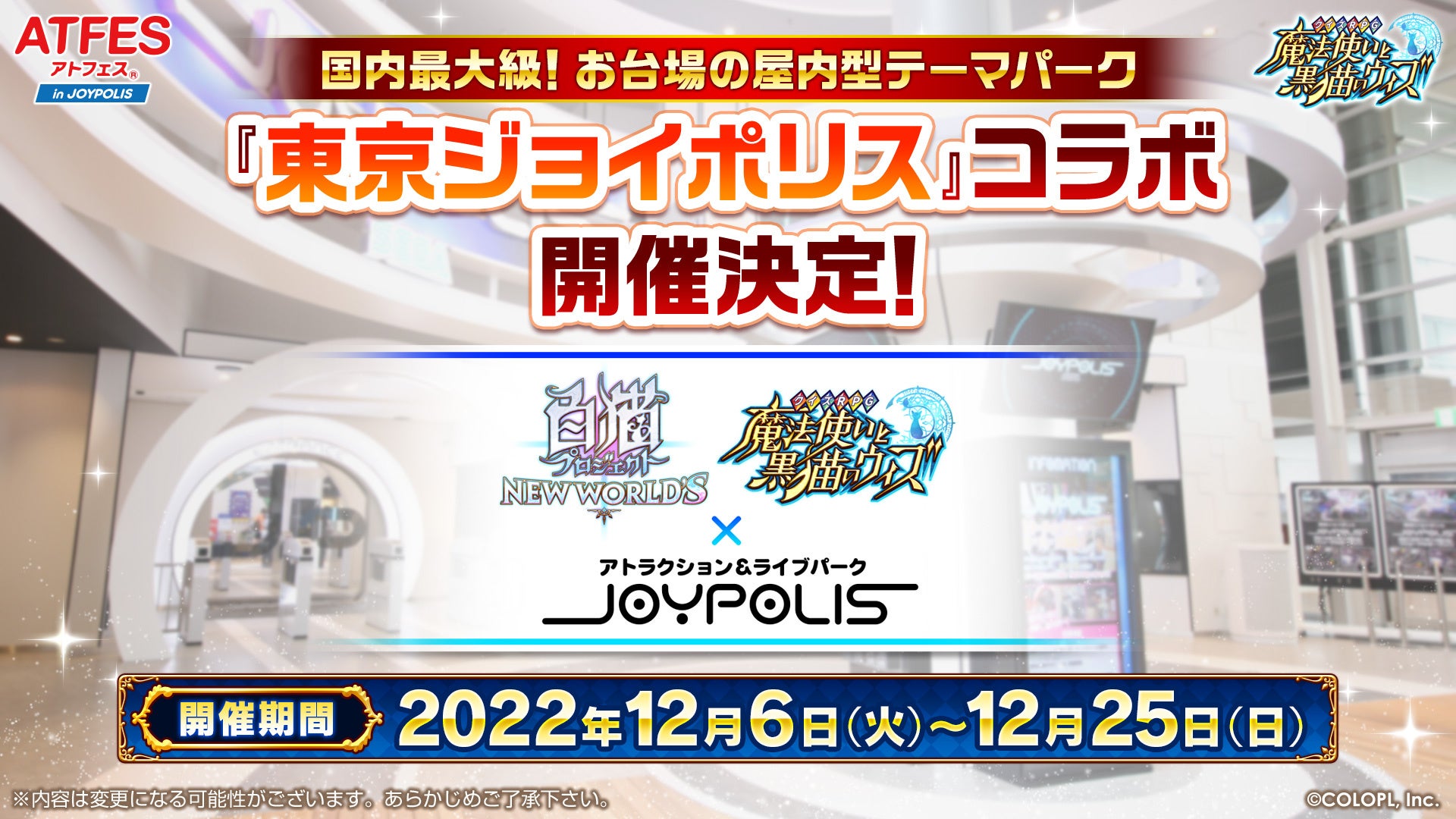 国内最大級の屋内型テーマパーク「東京ジョイポリス」と『白猫プロジェクト』、『黒猫のウイズ』がコラボ決定!それぞれコラボアトラクションが登場する予定。12月18日には大和田仁美さん、吉岡麻耶さんの二人が歌唱するステージイベントも予定されています。