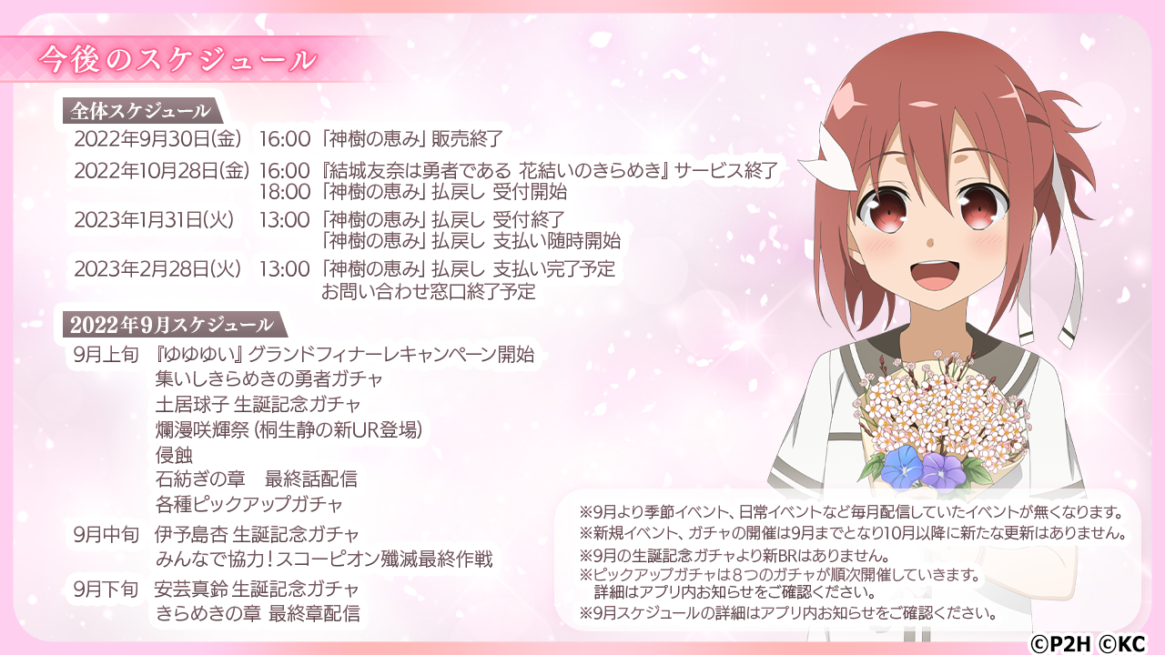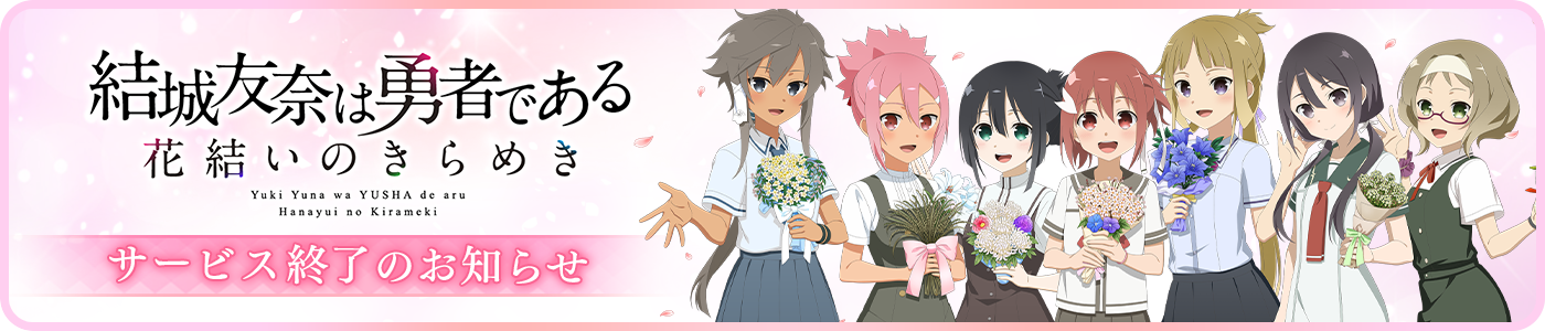 この度、『結城友奈は勇者である 花結いのきらめき』は、誠に勝手ながら2022年10月28日(金) 16:00をもちまして、サービスを終了させていただくこととなりました。