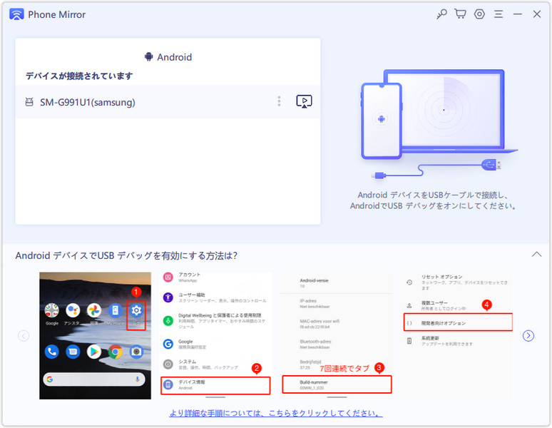 手順2:画面上の指示に従ってスマホ側で USB デバッグ有効にします。
