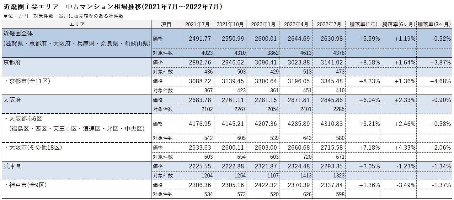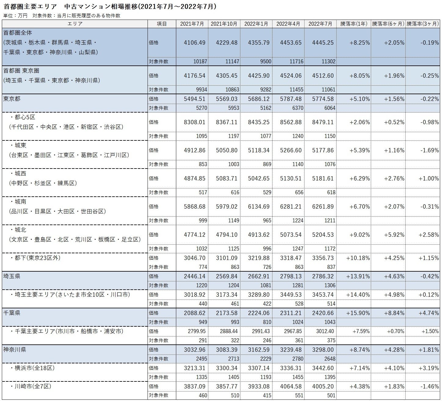 「マンションレビュー」2022年7月 全国主要エリア/47都道府県 中古マンション相場推移