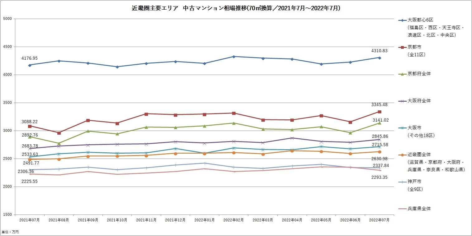 2022年7月の推定価格は4,310万8,300円。近畿圏全体の平均価格と比較して、約1,700万円近く高い。なお、近畿圏で価格がもっとも高い府県は「京都府」で、推定価格は3,141万200円。