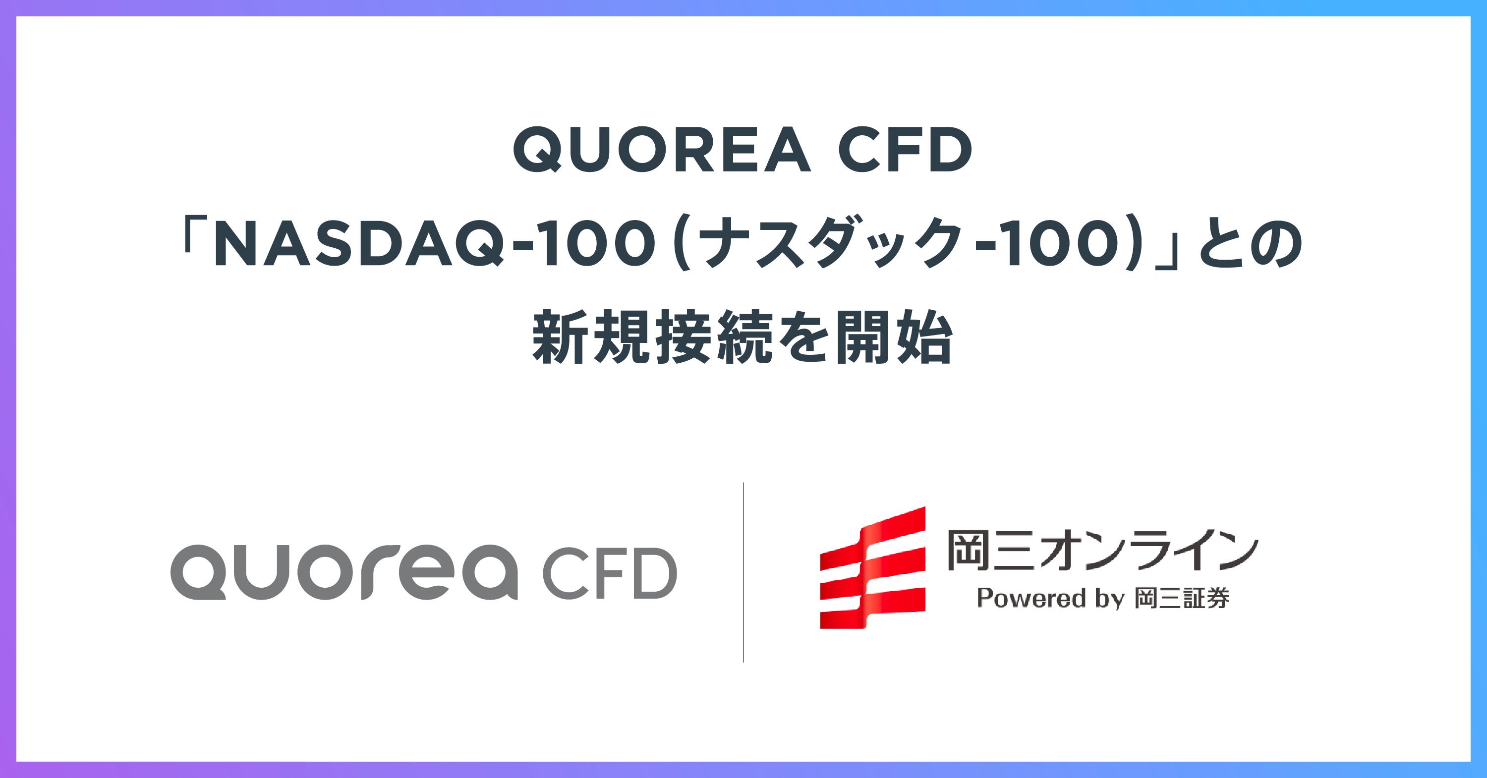 「岡三オンライン(岡三証券株式会社)」にて、このたび、従来可能であった日経225とNYダウに加えて、NASDAQ-100 (ナスダック-100)も自動売買可能となりました。岡三オンライン(岡三証券株式会社)の口座をお持ちの方は、すぐにQUOREA CFDの自動売買を開始することが可能です。岡三オンライン(岡三証券株式会社)のNASDAQ-100 (ナスダック-100)での自動売買は、約7000円からご利用可能となりますので、この機会に是非お試しください。