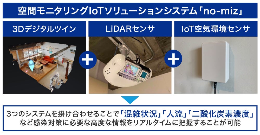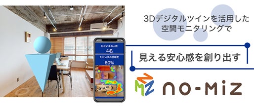 株式会社ゼロワンの提供する「no-miz」は、実在する部屋を特殊なスキャナーで読み取り、仮想空間上に同じ空間の3Dモデルを構築する3Dデジタルツインの技術を活用します。その3Dデジタルツイン上で、空気環境や人流などの情報を可視化することで、その空間の混雑具合や空気環境をリアルタイムでモニタリングすることができます。そして、空気環境などが悪化し感染症リスクが高まった場合は、ユーザーにアラートを出して注意喚起することができます。