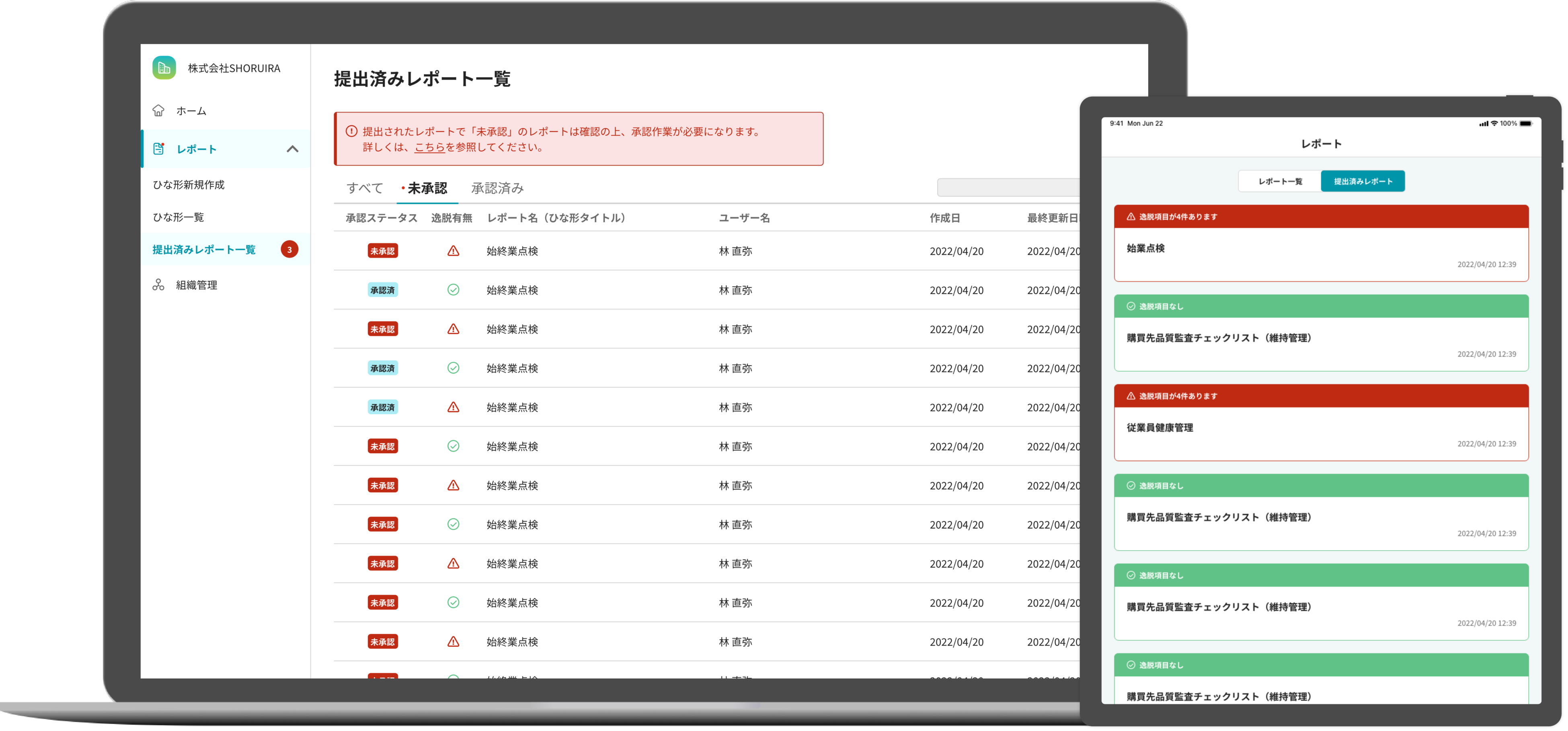 スマートフォン・タブレット・パソコンとあらゆるデバイスで、記録・報告の内容確認および承認作業を行うことができるため、管理者の確認工数を大幅削減します。
