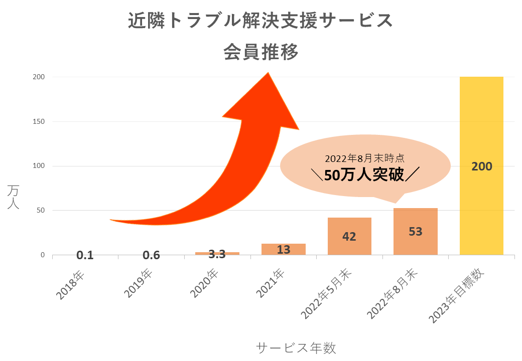 当社主要事業として展開している「近隣トラブル解決支援サービス」は、2016年のサービス開始から6年で、会員数は全国約53万人(2022年8月末現在)に上っています。直近で2022年5月末から約1.3倍、前年度から約4倍と急増しています。