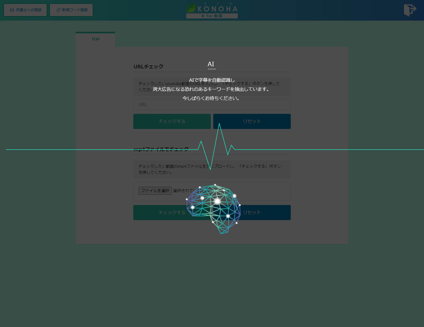 『KONOHA for 動画』は、1クリックで数十秒~数分で動画の文字起こしと薬機法や景品表示法等に抵触する恐れのある表現が含まれているかチェックすることができます。