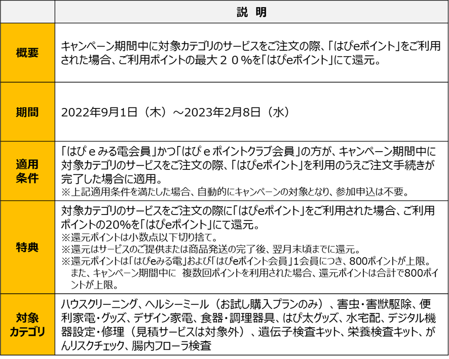 本キャンペーンでは、期間中にキャンペーン対象カテゴリのサービスをご注文の際に「はぴeポイント」をご利用された場合、ご利用ポイントの最大20%を「はぴeポイント」にて還元するものです。