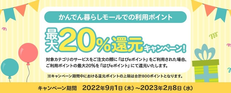 暮らしのお役立ちサービスに特化した、「はぴeみる電」会員向けのECモール「かんでん暮らしモール」において、より多くのはぴeみる電会員の皆さまがおトクにサービスをご利用いただけるよう、期間限定のキャンペーンを実施いたします。