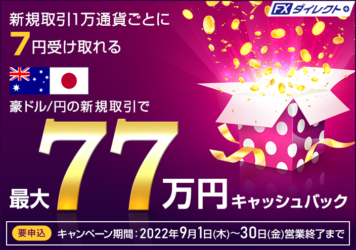 キャンペーンに申し込まれたお客さまに、期間中におけるFXダイレクトプラスでの豪ドル/円の新規取引合計数量に応じて、最大770,000円【新規取引1万通貨ごとに7円】をキャッシュバックします。