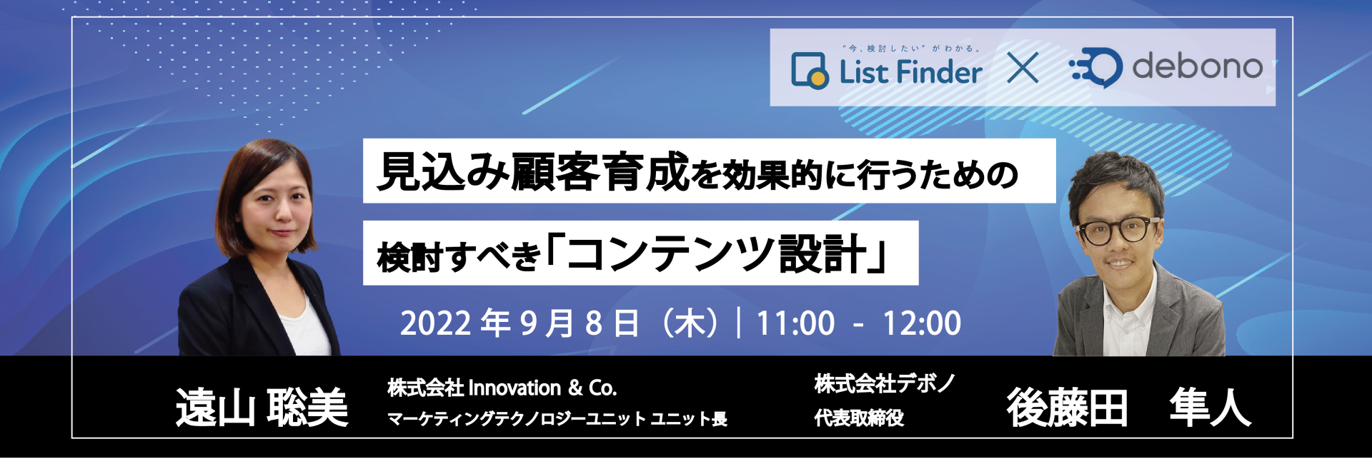 株式会社イノベーション(東証グロース 証券コード3970)のグループ会社である、株式会社Innovation & Co.(本社:東京都渋谷区、代表取締役社長:齊藤和馬、以下「Innovation & Co.」)は、Web/PRコンサルティングサービスを提供する株式会社デボノ(本社:東京都港区、代表取締役 後藤田隼人・安達亮介、以下「デボノ社」)と共催で、「見込み顧客育成を効果的に行うための検討すべき『コンテンツ設計』」をテーマとしたセミナーを2022年9月8日(木)に開催します。