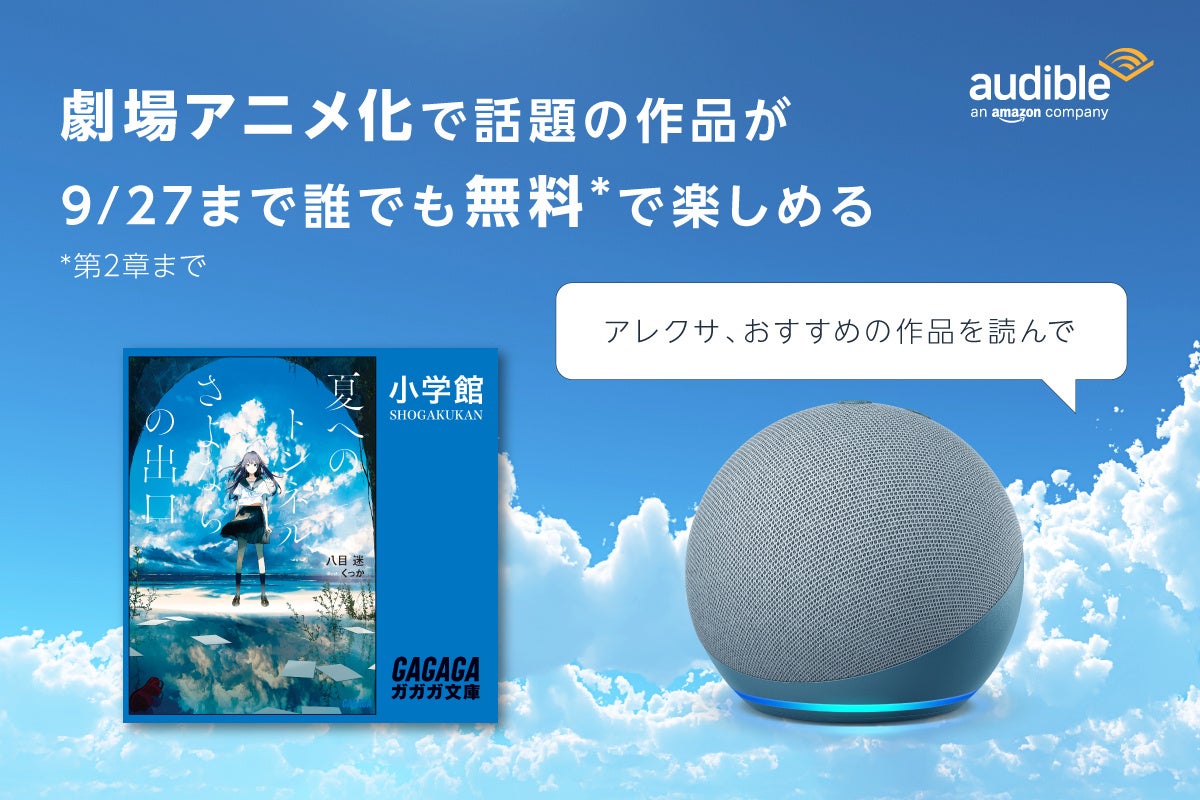 世界最大級のオーディオブック及び音声コンテンツ制作・配信サービスであるAmazon オーディオブックAudible(以下、オーディブル)は、クラウドベースの音声アシスタントAlexaで『夏へのトンネル、さよならの出口』のタイトル、1章、2章の朗読が無料で聴ける期間限定キャンペーンを本日開始します。2022年9月27日(火)までの期間中、オーディブル会員に限らずAmazon EchoシリーズやFire TVシリーズなどのAlexa搭載デバイス、 Alexaアプリをお持ちであれば誰でもお楽しみいただけます。