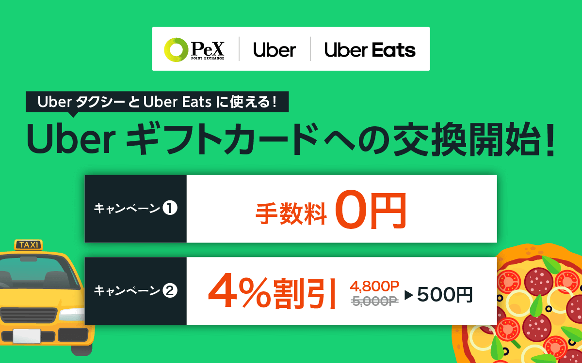 ・交換レート:PeXポイント4,800P → Uber ギフトカード500円 →期間限定で4%割引を実施します(終了日未定)