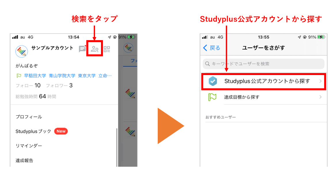 ・「Studyplus公式アカウントから探す」をタップ
