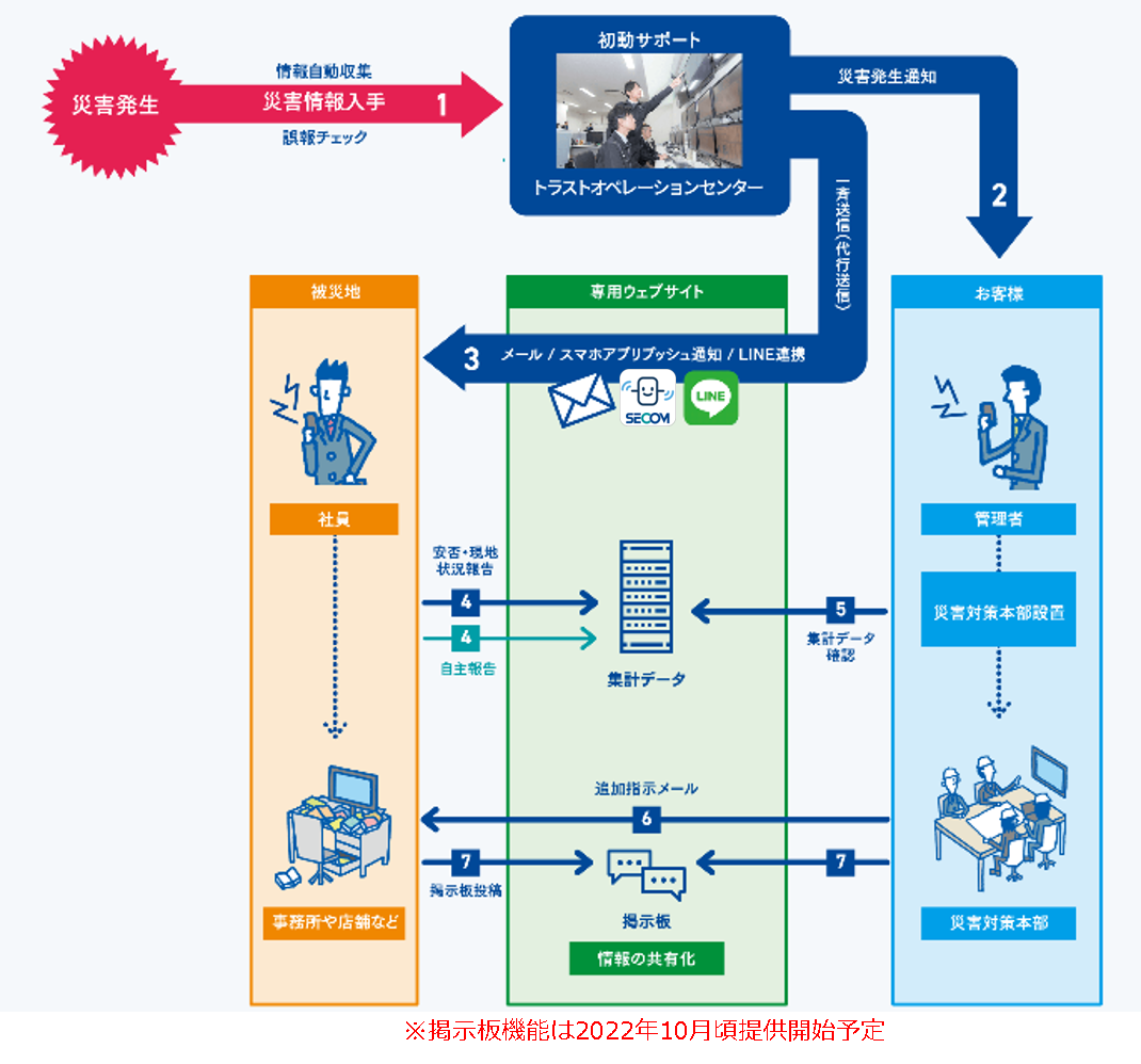 昨今、日本各地で地震や大雨による自然災害が頻発しており、企業の危機管理はますます重要性を増しています。豊富なノウハウと確かな実績を持つセコムグループが提供する本サービスの提供を通して、より多くの企業の迅速な安否確認と的確な初動対応をサポートしてまいります。