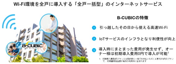 集合住宅に全戸一括で入居者が無料でインターネット接続できるサービスです。大手通信事業者のインターネットサービスは、利用を希望する入居者からの個別の申し込みと個別の導入工事が必要であり、各入居者には初期工事費用や毎月の利用料の負担が発生しますが、「B-CUBIC」は、入居者からの申し込みは不要、かつ無料でインターネットの利用が可能となります。