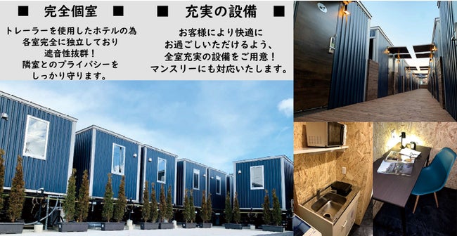 トレーラーホテルは、ヒーローライフカンパニーが東日本大震災の経験から開発した工場生産型木質ユニットを車体に設置し、宿泊施設として提供するもので、移動が可能。災害時の仮設避難場所やコロナ対策の隔離施設として要請があった場合は、移動して社会貢献活動が可能な「動くホテル」です。無人チェックインシステムで非接触、完全独立型の部屋、密にならない開放廊下で感染症対策を強く意識したホテルになっています。