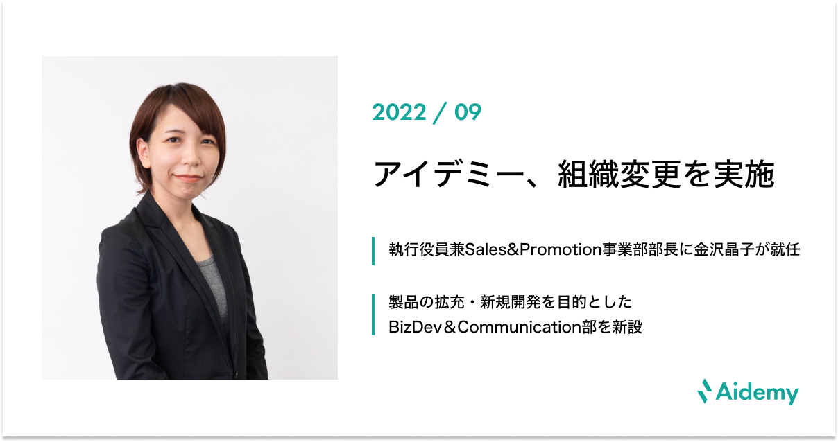 この度、執行役員兼Sales&Promotion事業部部長に就任した金沢は、2020年10月にAidemyに入社いたしました。法人向けのデジタル人材を育成するプラットフォーム「Aidemy Business」の提供において顧客への導入・活用支援の領域で幅広い業務を担当し、導入後の顧客への定着率や満足度の向上などに貢献してきました。また、チームメンバーや社内からの信任も厚く、リーダーシップを発揮しチームを牽引しています。また、この度の組織変更に際し、アイデミーは新たに、「Aidemy Business」の更なる提供拡大および新規事業の開発に重点を置く部署としてBizDev&Communication部を設置し、木之内毅が部長に就任いたしました。アイデミーは、本組織変更により、経営体制を更に磐石なものとし、法人向けのビジネス展開を一層加速します。