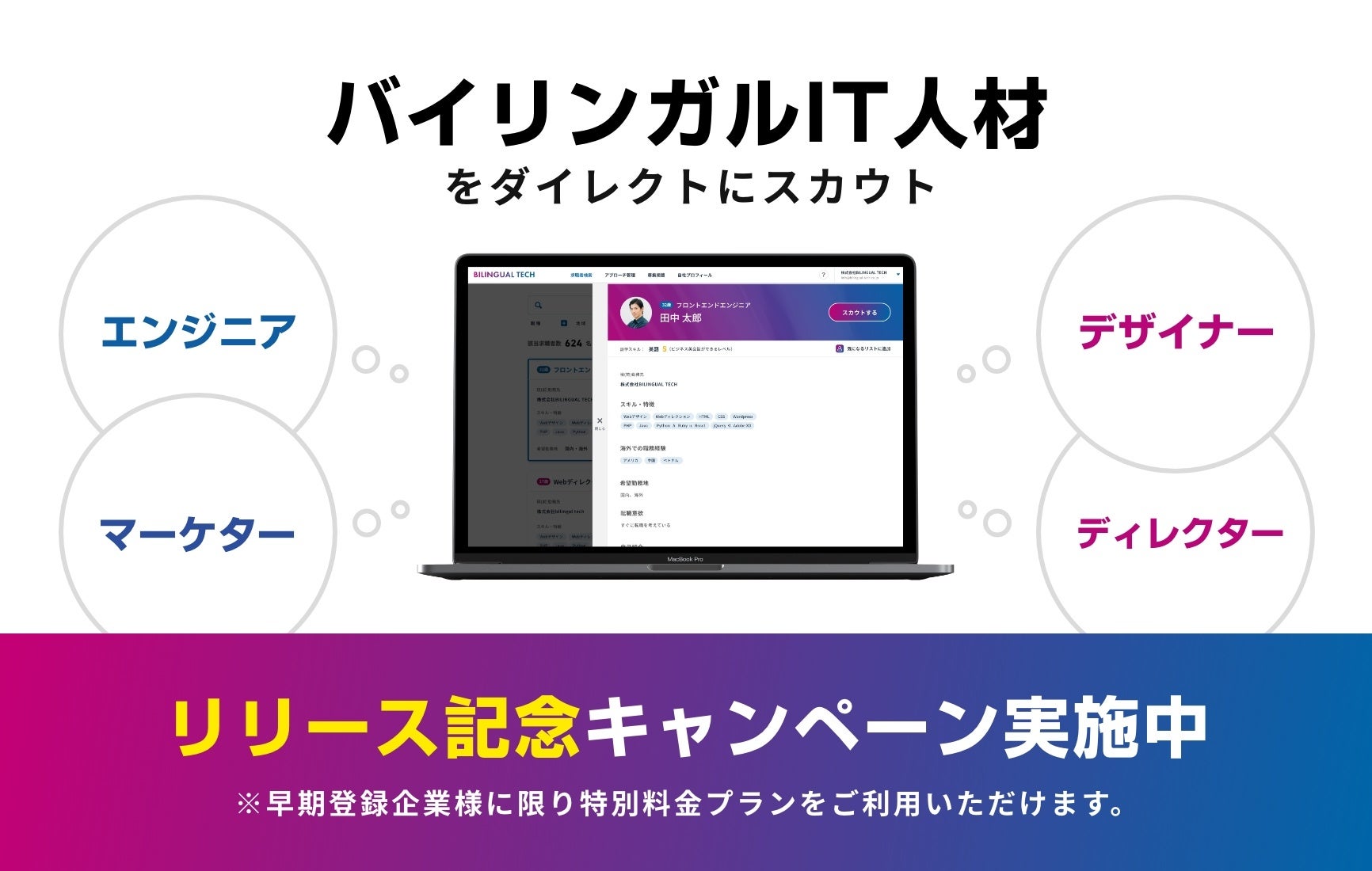 BILINGUAL TECH はバイリンガルIT人材に特化したプラットフォームとしてデータベースを構築しています。そのため、ITスキルと語学スキルを兼ね備えたターゲット人材にピンポイントでアプローチすることが可能です。