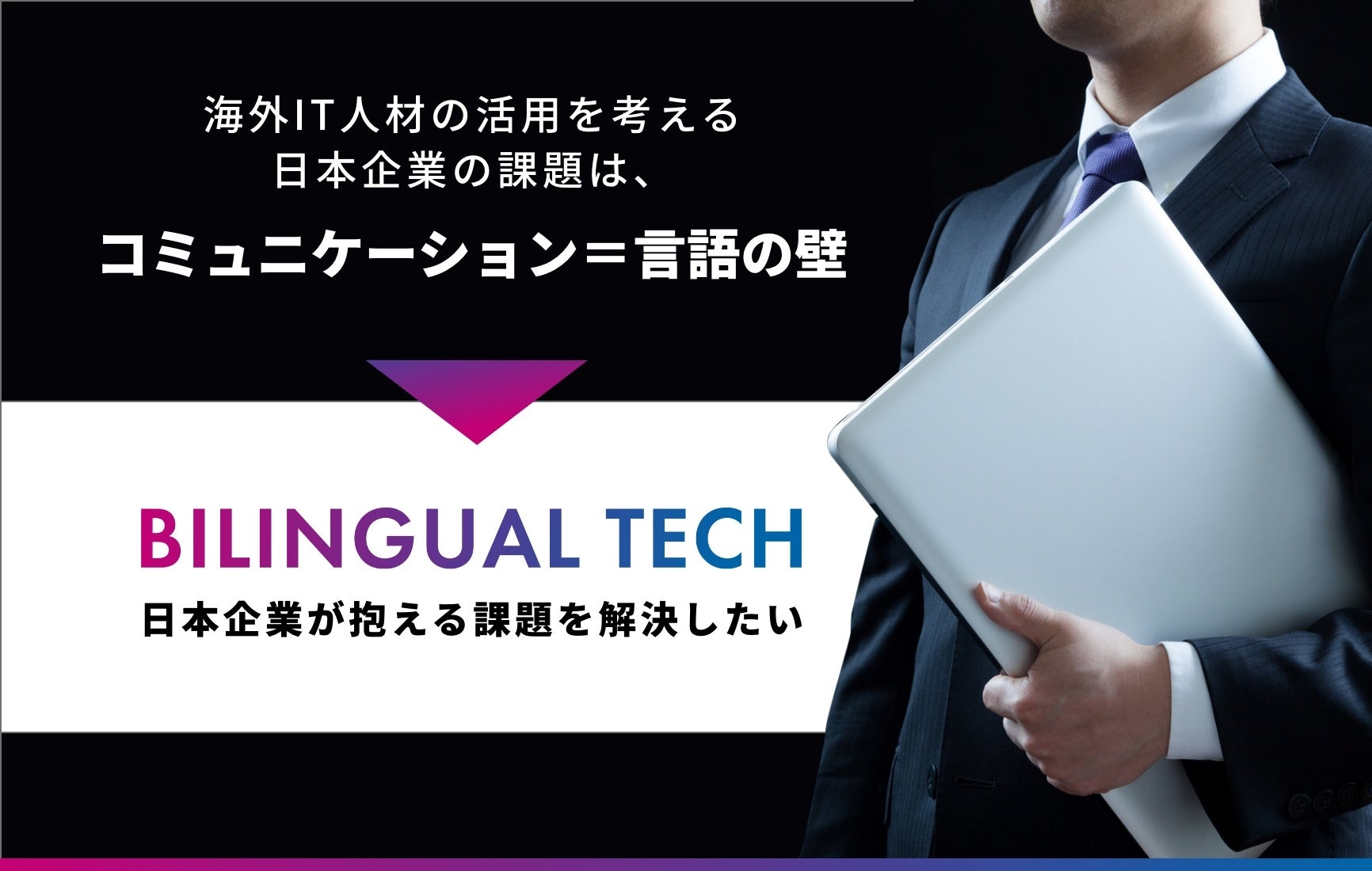 私たちは、その課題を解決し、全ての日本企業が言語にとらわれることなく、自由に世界へ挑戦できる未来を作りたい、そんな想いからバイリンガルIT人材に特化した採用プラットフォームを構築しました。