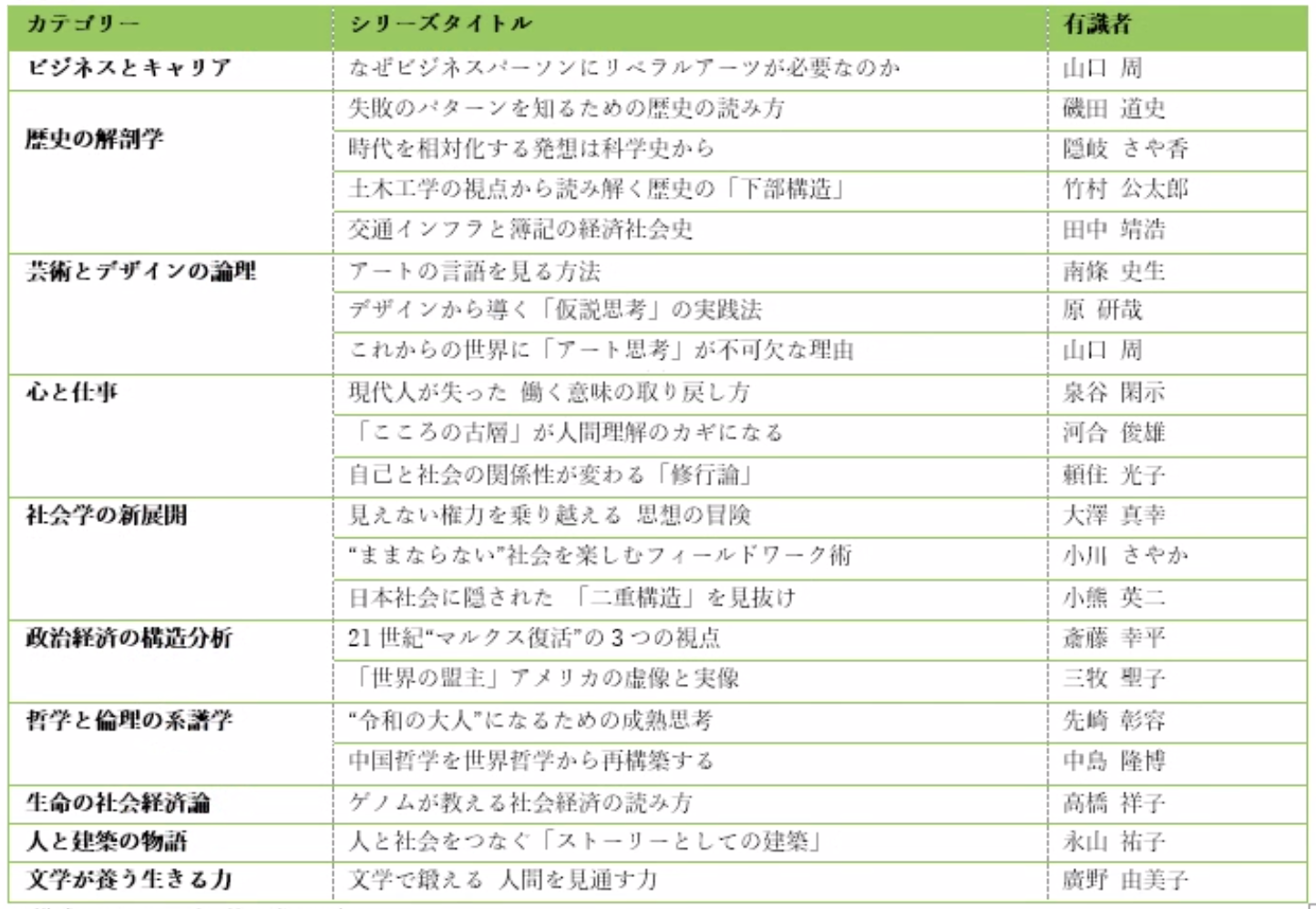 | 内容 | 哲学、倫理、社会、歴史、芸術、政治、経済など、多彩な分野のオンライン映像学習を通じて、将来を予測することが困難な現代に求められる「自ら考え、問いを立てることができる力」「本質を見抜く力」「複眼的視点」を習得できます。 |
