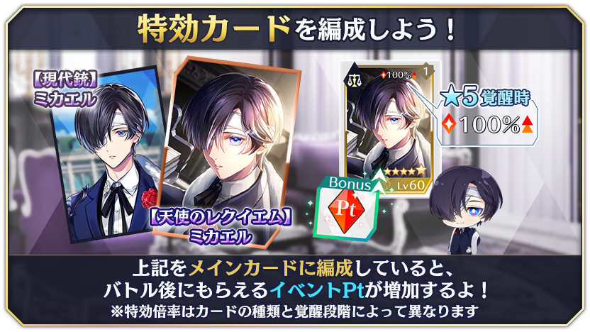 ★3以上のカードには、固有の『カードストーリー』が付き、★4に覚醒することでイラストがLive2Dに変化します!また、★3「【天使のレクイエム】ミカエル」をメインカードに編成すると、現在開催中のイベントクエストで特攻効果が発動します!是非お迎えしてイベントを有利に進めましょう!