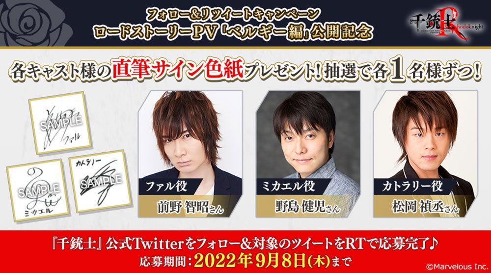 PV公開を記念して、『千銃士』公式Twitterアカウントでは前野智昭さん(ファル役)、野島健児さん(ミカエル役)、松岡禎丞さん(カトラリー役)の直筆サイン色紙が抽選で各1名様に当たるフォロー&リツイートキャンペーンを開催中です。応募の締切は2022年9月8日(木)23:59まで!奮ってご応募くださいませ!