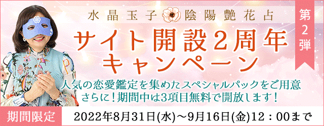 この度、月額公式サイト『水晶玉子 陰陽艶花占』にて『サイト開設2周年キャンペーン第2弾』を公開しております。人気の恋愛鑑定を集めたスペシャルパックのうち3項目は無料開放しております。この機会をどうぞお見逃しなく!