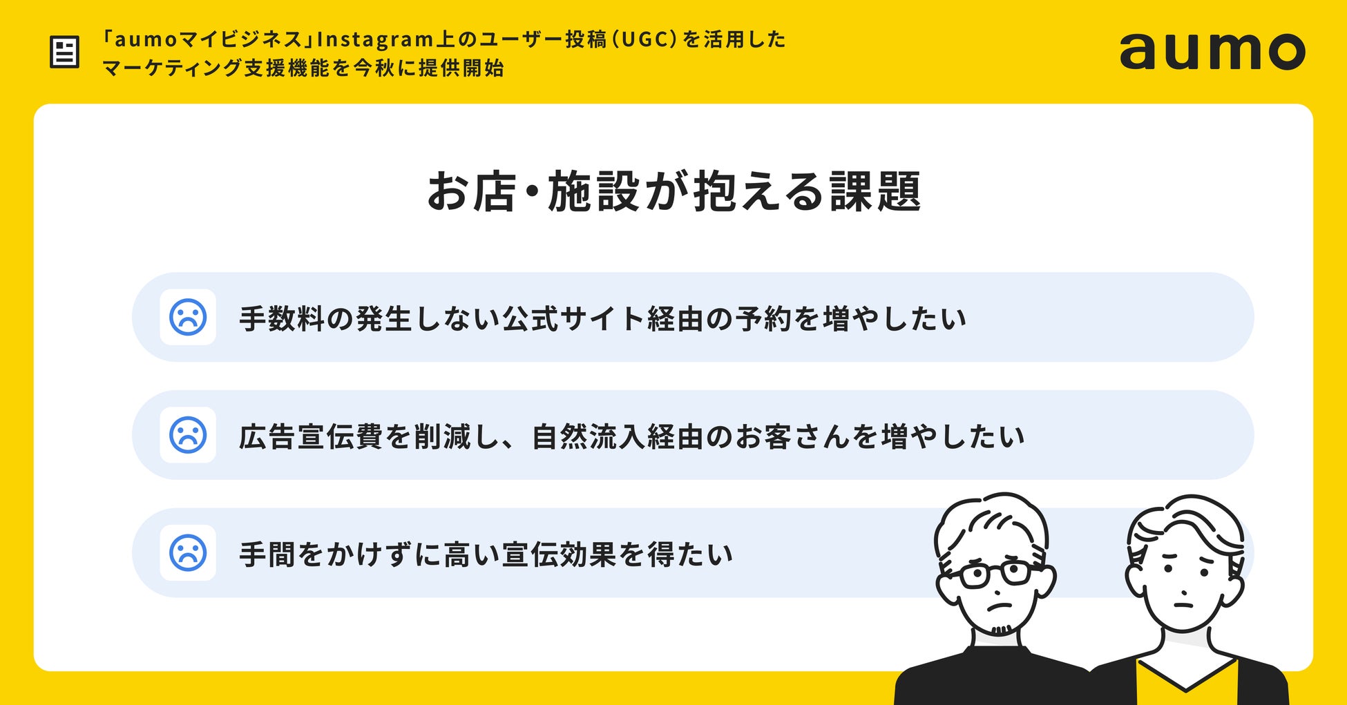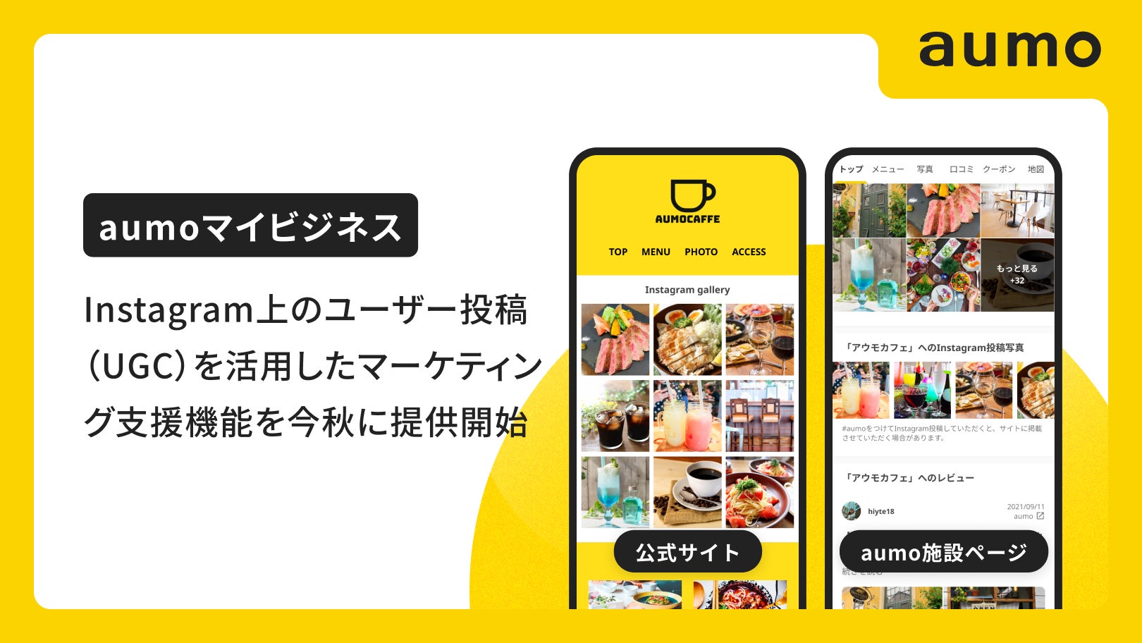 この度、UGC活用マーケティング支援機能の提供を開始した「aumoマイビジネス」は、グルメや宿泊、小売店などの事業者向けに売上や集客効果の向上を支援するマーケティングSaaSです。1500万MAUを突破した国内最大規模のおでかけメディア「aumo」のドメインパワーに加え、SNS管理分析機能との連携やGoogleビジネスプロフィールの管理機能を組み合わせることで、実店舗のマーケティングに効果の高いSEO・SNS・MEOの3つを網羅的に活用することができます。