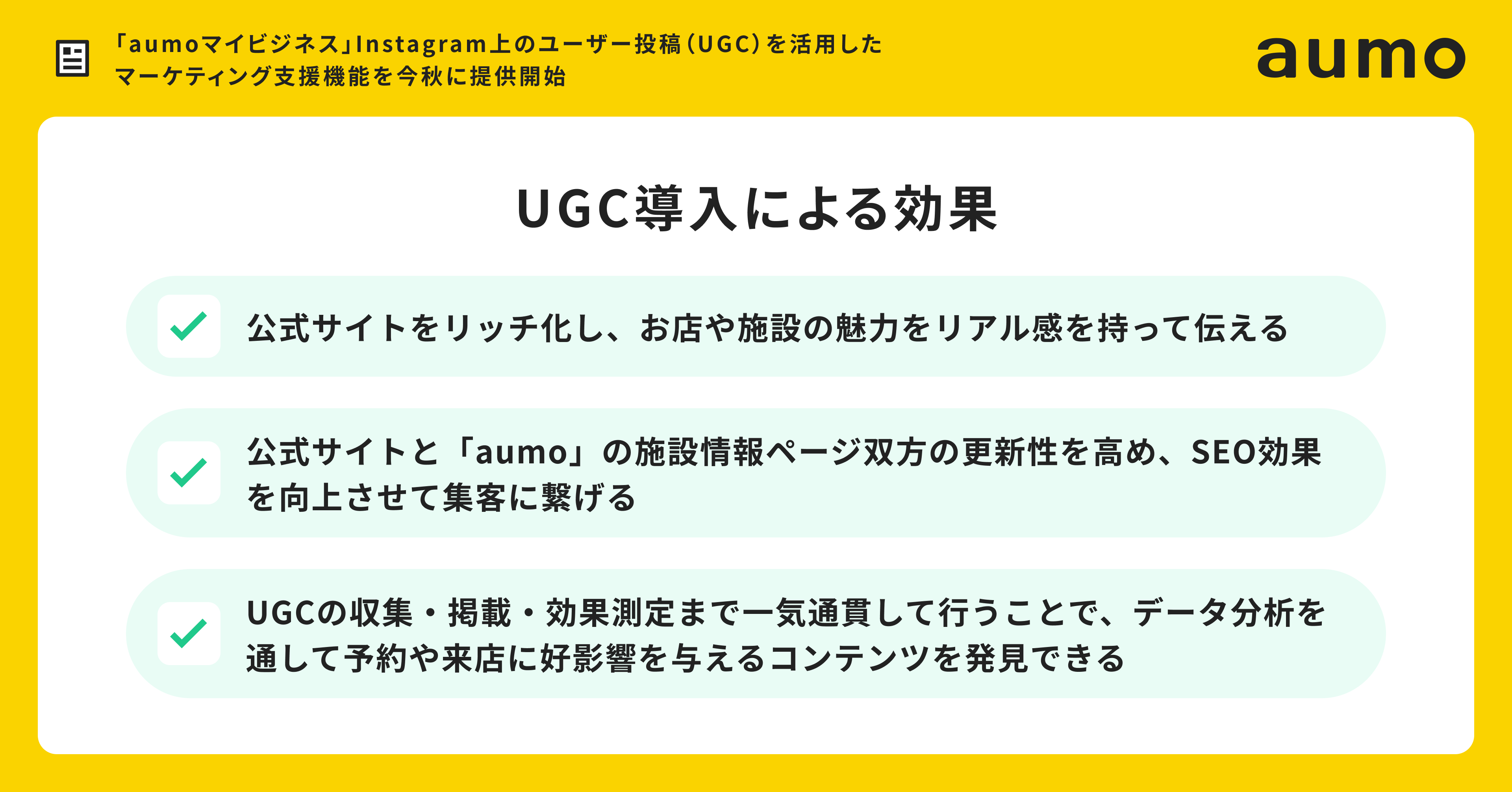 この度、UGC活用マーケティング支援機能の提供を開始した「aumoマイビジネス」は、グルメや宿泊、小売店などの事業者向けに売上や集客効果の向上を支援するマーケティングSaaSです。1500万MAUを突破した国内最大規模のおでかけメディア「aumo」のドメインパワーに加え、SNS管理分析機能との連携やGoogleビジネスプロフィールの管理機能を組み合わせることで、実店舗のマーケティングに効果の高いSEO・SNS・MEOの3つを網羅的に活用することができます。