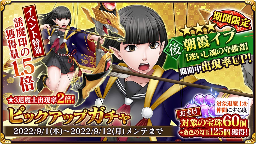 期間限定で「★3退魔士確定プレミアムガチャ」「ピックアップガチャ」が開催中です! 本ガチャでは、★3退魔士の出現率が通常3%のところ、2倍の6%となっております! さらに玉魂武器シリーズ「朝霞イブ【迷いし魂の守護者】」の出現率がUPします! 「★3退魔士確定プレミアムガチャ」では、10連目で必ず★3退魔士が獲得できます!