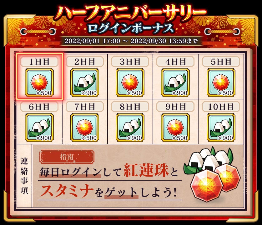 期間中、ゲームにログインすると、最大で紅蓮殊2,500個、スタミナ4,500個、霊晶12,500,000個、金の勾玉750個をプレゼントします。