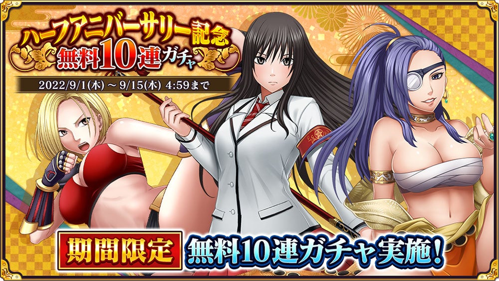 9月1日メンテナンス後から、1日1回ハーフアニバーサリー記念無料10連ガチャを開催中です。期間中ログインすると、最大140連分のガチャを引くことができます。また、本キャンペーン期間中にログインできない日があった場合、次回ログイン時にまとめて引くことができます。