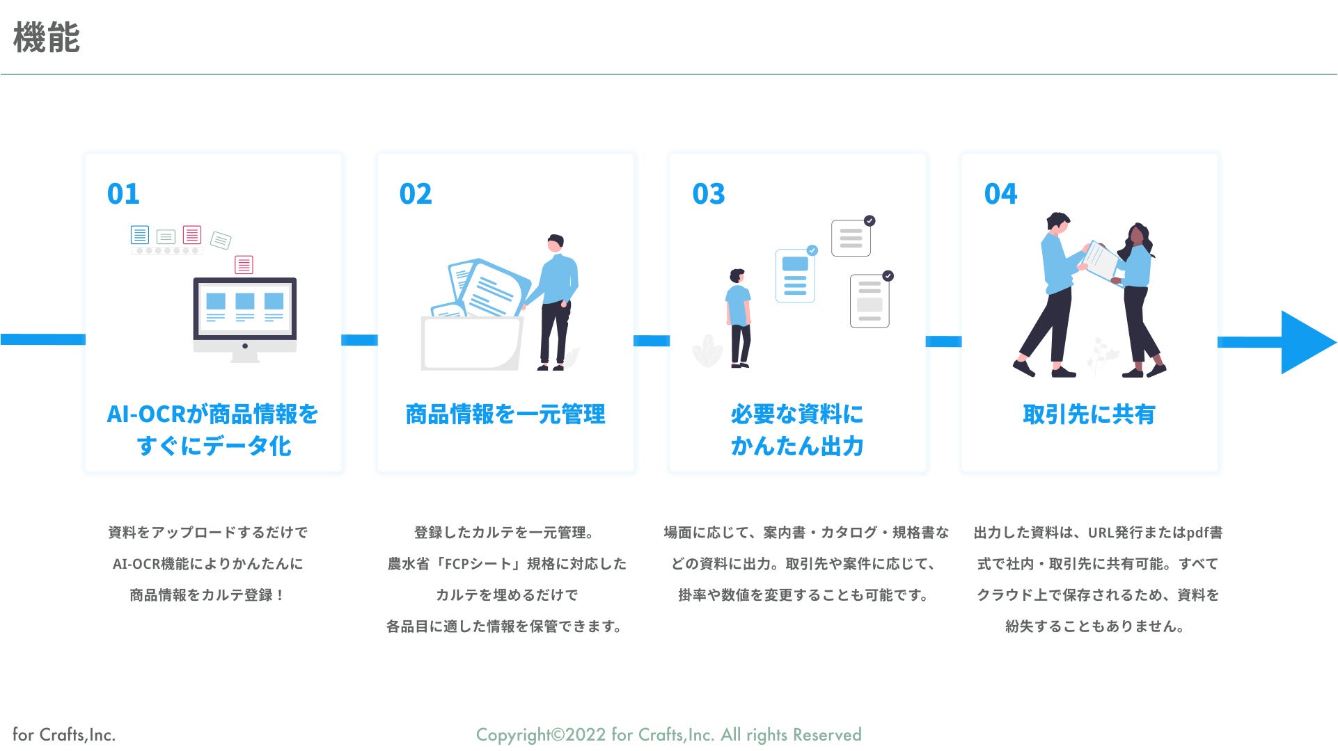 商品情報は、quote上の商品カルテに登録され、同じチームのユーザーであればクラウド上で管理が可能です。農林水産省「FCPシート」規格に対応しているため、quote上を埋めるだけで商談に抜け・漏れはありません。