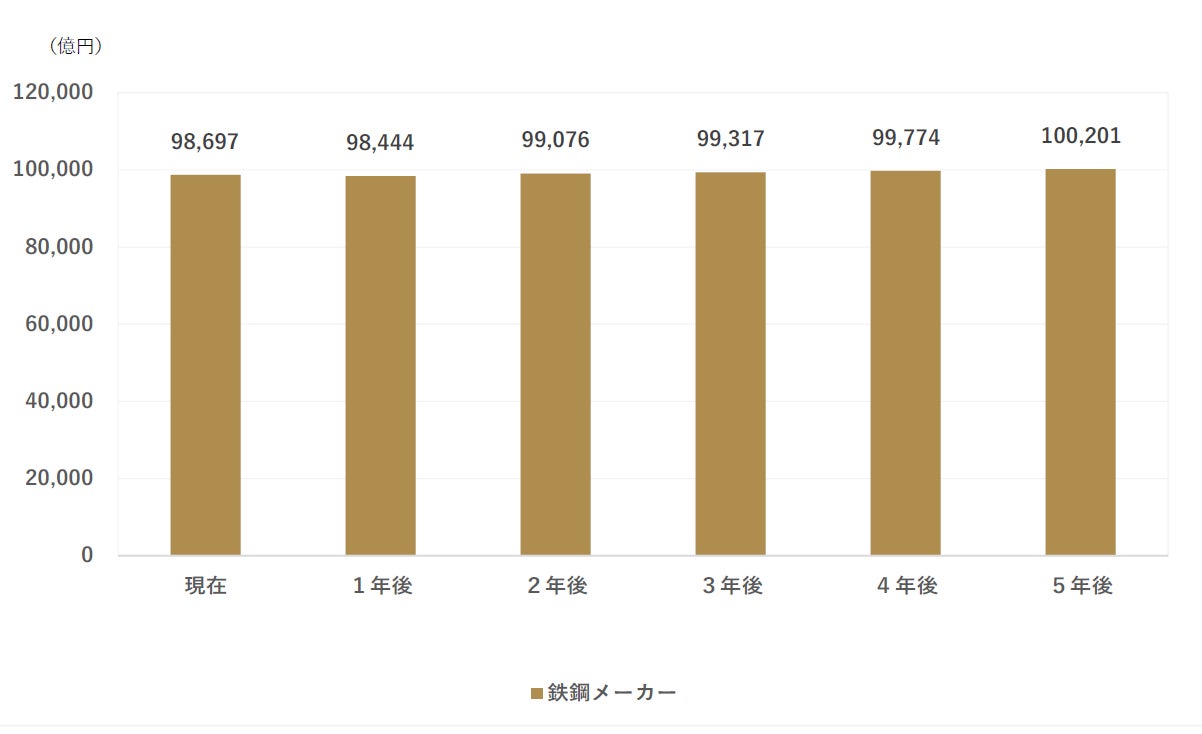 鉄鋼メーカーの国内市場規模は現在の9兆8,697億円から今後5年間で1.52%成長し10兆201億円に達すると予測する。脱炭素社会への移行など鉄鋼業の伸長が危ぶまれる中、需要の見込まれるレアメタルへシフトするなど多角化戦略が成長に寄与した。また、時系列でみると、2年後、4年後の成長が比較的大きいと予測する。