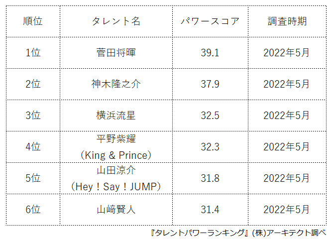 本ランキングは、2022年5月度に実施したタレント調査データ(一部過去実施データ)を利用し、タイトルに応じてランキング形式でまとめたものです。